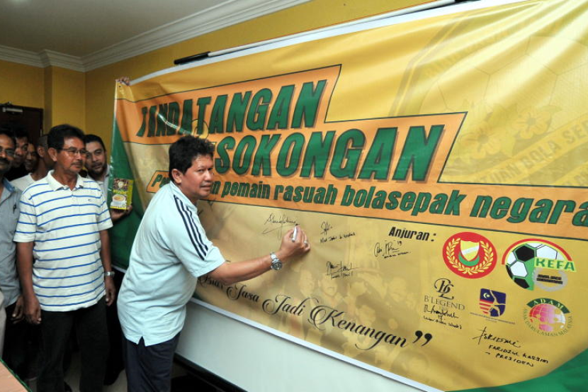 Faridzul Kassim menurunkan tandangan pada kain rentang sebagai tanda sokongan pengampunan 216 bekas pemain bola sepak negara yang terlibat dalam rasuah pada 1994, pada sidang media di Stadium Darul Aman, Isnin. Foto: Bernama