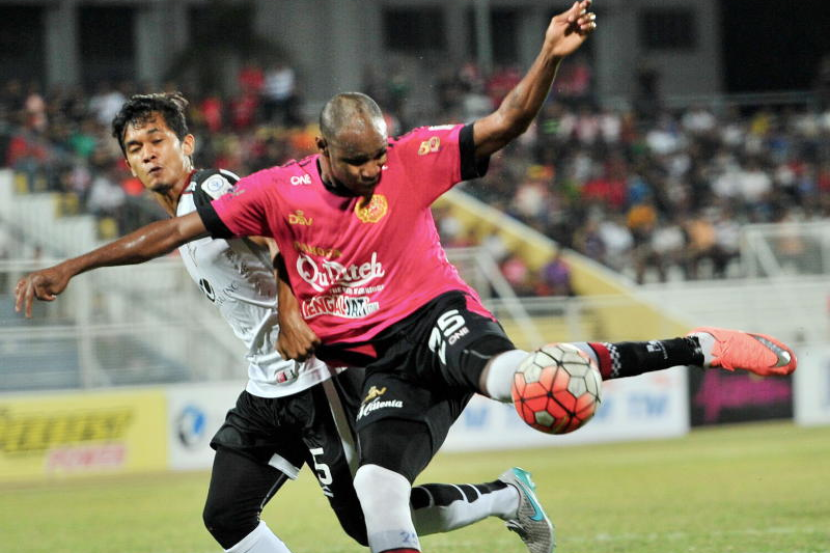 Pemain Kelantan Dramane Traore (kanan) berjaya merembat bola meskipun dihalang pemain T-Team Mohamad Hasbullah pada aksi Liga Super di Stadium Sultan Ismail Nasiruddin Shah, Selasa malam. Foto: Bernama