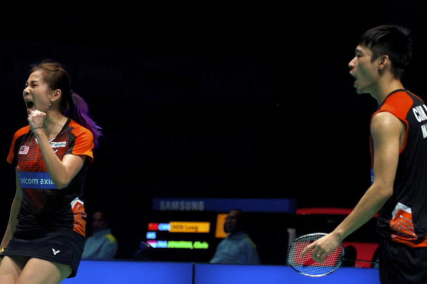 Pasangan beregu campuran negara Goh Liu Ying (kiri) dan pasangannya Chan Peng Soon meraikan kejayaan setelah menewaskan beregu campuran nombor satu dunia dari China Zhang Nan dan Zhao Yunlei pada peringkat separuh akhir Kejohanan Badminton Terbuka Malaysia di Stadium Malawati, Sabtu.