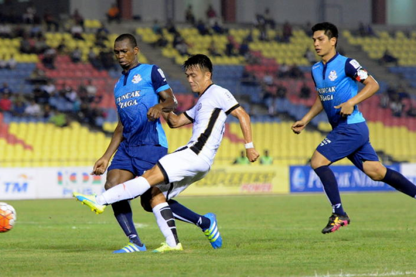 Pemain Terengganu, Joseph Kalang Tie (jersi putih) melepaskan rembatan untuk gol penyamaan ketika menentang pasukan Polis Diraja Malaysia pada perlawanan Liga Super di Stadium Hang Jebat, Ahad malam. -fotoBERNAMA