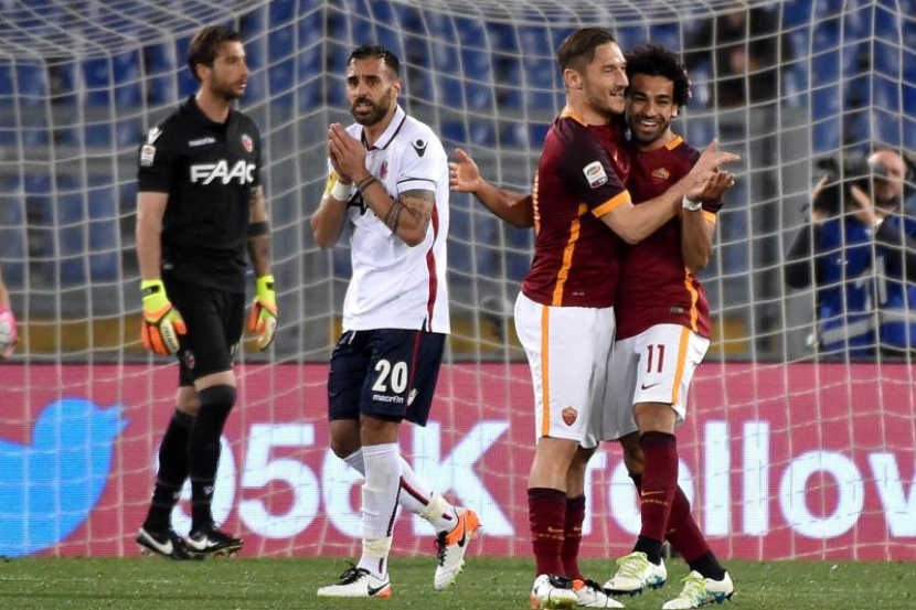 Pemain AS Roma, Mohamed Salah (kanan) meraikan kejayaan dengan Francesco Totti (dua dari kanan) selepas menjaringkan gol penyamaan 1-1 ketika pasuka itu menetang FC Bologna.