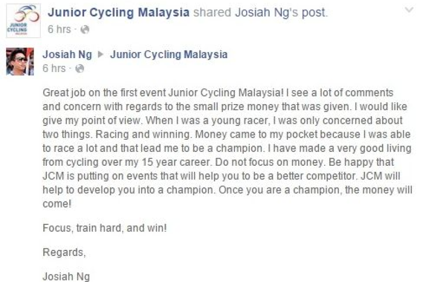 "Saya hidup senang kerana berbasikal sepanjang karier saya lebih 15 tahun. Jangan fokus kepada wang.