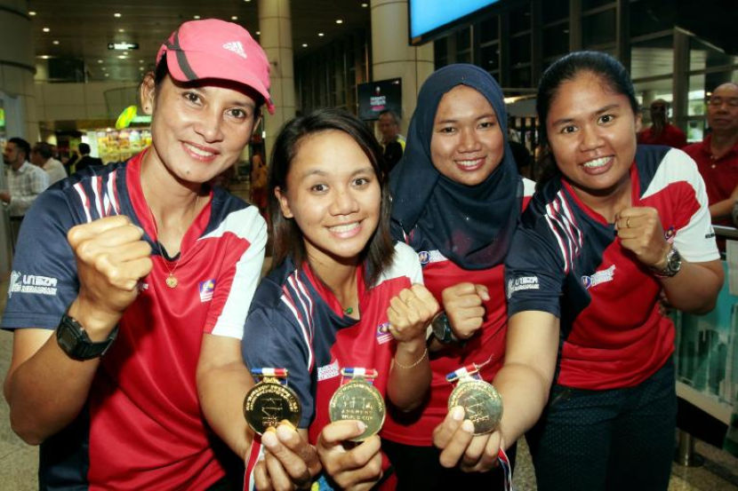 Dari kiri: Norizah Ishak,Fatin Nur Fatehah Mat Salleh,Nor Hayati Al Madihah Hashim dan Saritha Cham Nongn menunjukkan pingat emas yang dimenangi pada aksi Piala Dunia di Shanghai tahun lalu. Foto:SHAARI CHEMAT / The Star.