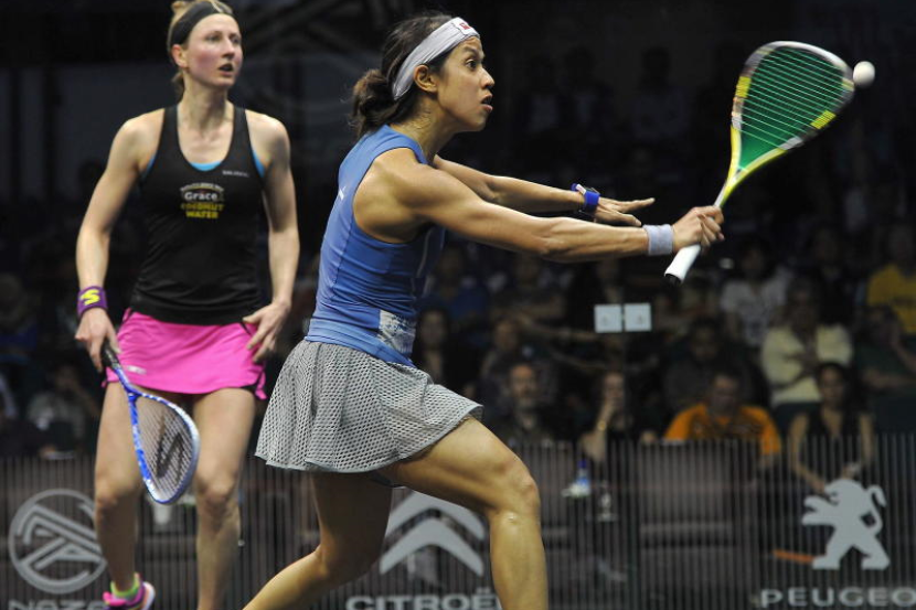 Nicol David (kanan) ketika beraksi menentang pemain England Alison Waters (kiri) pada kejohanan skuash wanita dunia PSA di Pusat Skuasy Negara pada Rabu. Foto: Bernama
