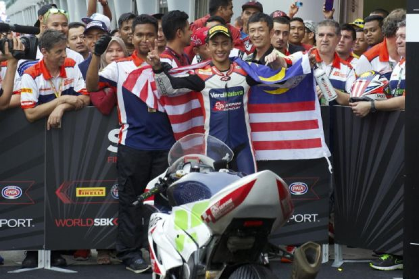SEPANG: Pelumba Itali, Ayrton Badovini daripada pasukan GEMAR Ballons-Team Lorini meraih kemenangan sulung musim ini dalam kelas Supersport pada Kejuaraan Superbike Dunia - Pusingan Malaysia di Litar Sepang, Ahad.