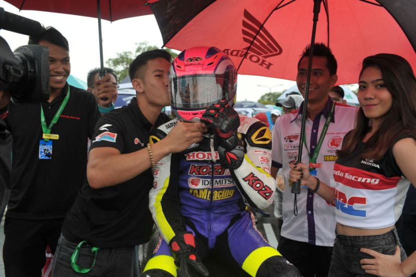 Khairul mencium adiknya sebagai sokongan pada Pusingan 5 Kejuaraan Cub Prix AAM Malaysia Petronas di Teluk Intan.