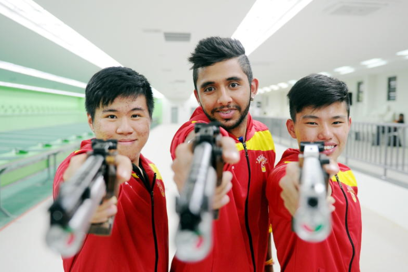 Trio penembak Selangor (dari kiri) Ng Chen Shin, Rishipal Singh Dhanoa dan Tan Tong Tat memberikan gaya tersendiri selepas cemerlang dalam acara 10 Meter Air Pistol Lelaki Berpasukan sempena Sukan Malaysia (Sukma) ke-18 di Pusat Menembak Petra Jaya Sarawak pada Khamis. Foto: Bernama