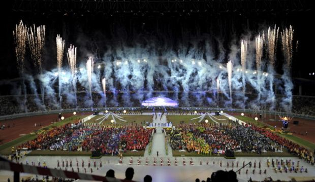 kilauan cahaya bunga api menyinari ruang angkasa stadium.