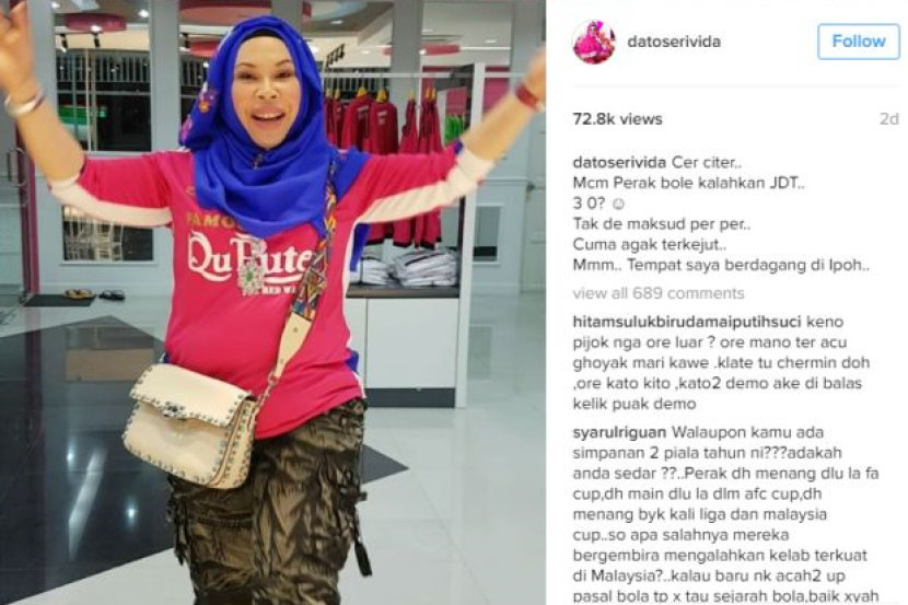 Terdahulu, Vida memuat naik video dalam loghat Perak 'cer citer' yang bertanya kepada pengikutnya di Instagram mengenai kekalahan JDT pada Ahad lalu.