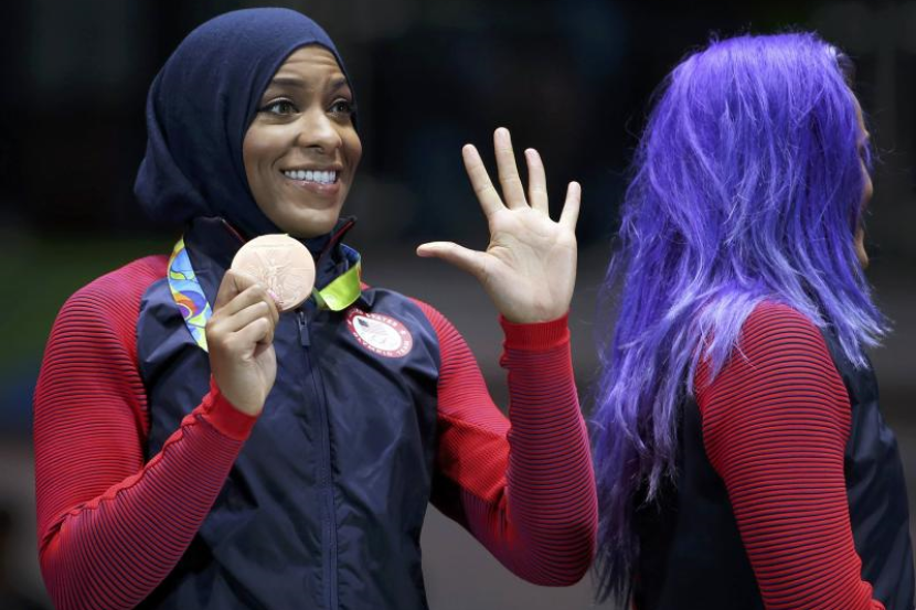 Ibtihaj yang menjadi atlet AS pertama di Olimpik yang memakai hijab ketika kejohanan awal minggu ini, memenangi pingat gangsa, awal pagi Ahad dalam acara sabre berpasukan.