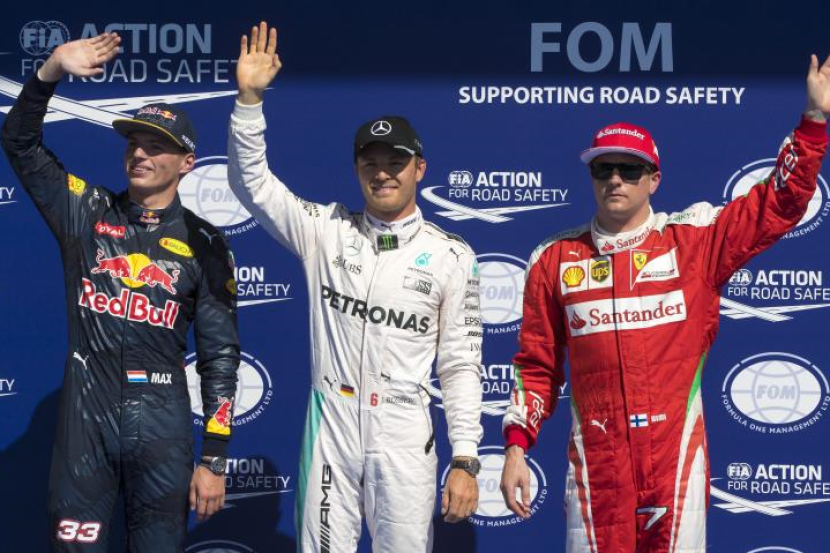 Rosberg (tengah) bersama Verstappen dan Raikkonen (kanan) selepas aksi kelayakan GP Belgium,lewat Sabtu malam.
