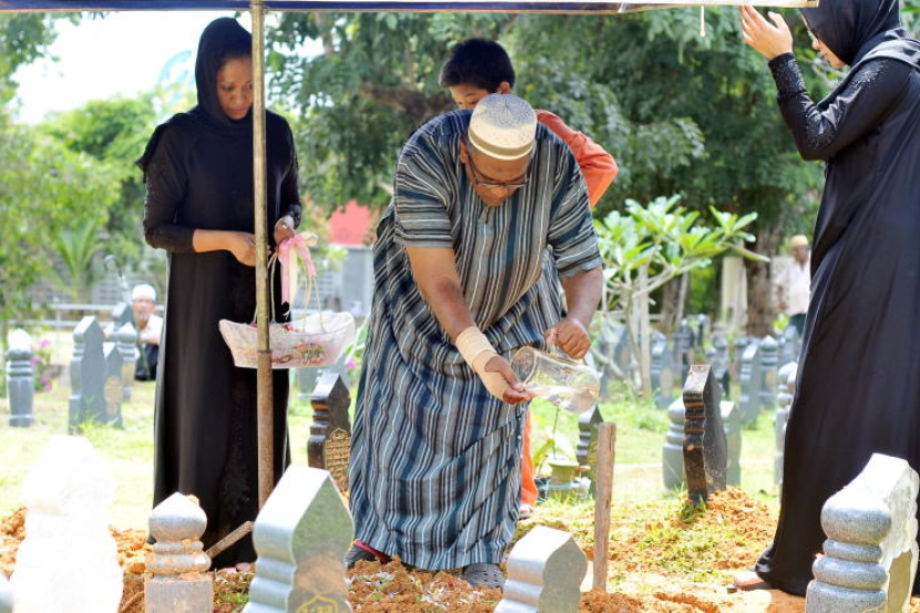 Yuzaily menyiram air mawar pada pusara bapanya di tanah perkuburan Islam Masjid Al-Bukhari, Sabtu. Foto:Bernama