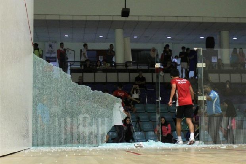 Panel kaca di Gelanggang 4 itu pecah ketika pemain bawah 19 tahun, Chua Man Chin (Singapura) dan Mojtaba Kafili Vijouyeh (Iran) sedang beraksi, Selasa.