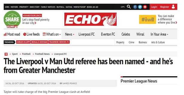 Malah portal berita kelab itu, Echo turut mempertikaikan keputusan untuk melantik Taylor sebagai pengadil perlawanan kedua-dua kelab terbabit.