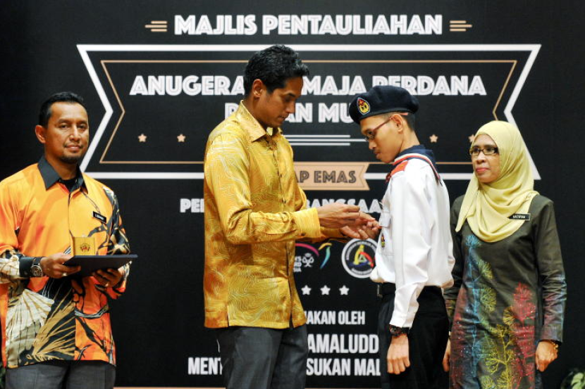 Khairy Jamaluddin memakaikan lencana Tahap Emas semasa Majlis Pentauliahan Anugerah Remaja Perdana Rakan Muda Tahap Emas Peringkat Kebangsaan 2016 pada Khamis. -fotoBERNAMA