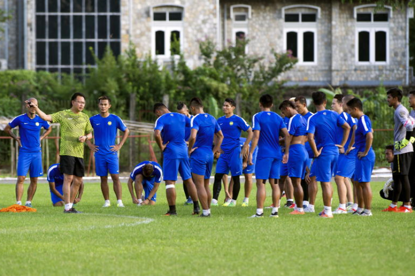 Kim Swee (dua, kiri) memberi arahan kepada skuad negara ketika menjalani latihan di Stadium Thuwunna. Foto: Bernama