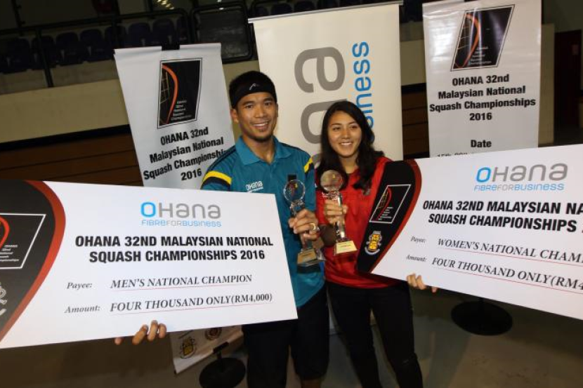 Mohd Nafiizwan Mohd Adnan (kiri) dan Delia Arnold bergambar bersama trofi kemenangan setelah memenangi perlawanan akhir Kejohanan Skuasy Kebangsaan 2016 di Pusat Skuasy Nasional, Bukit Jalil pada Ahad. -NORAFIFI EHSAN/The Star