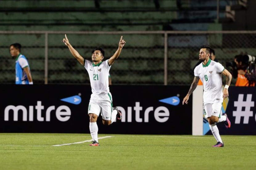 Andik Vermansyah meraikan jaringan gol ketika bertemu Singapura pada Jumaat malam. Foto:EPA