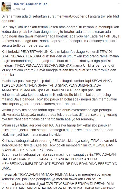 "Biarlah ikut cara masing-masing. Saya bangga TRW sebagai pasukan bola sepak negeri dan mempunyai cara tajaan yang teratur, berdokumen dan transparent (telus)," jelas Annuar.