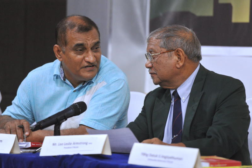 Presiden Persatuan Olahraga Wilayah Persekutuan Kuala Lumpur, Leo Leslie Armstrong (kanan) bersama Karim Ibrahim (kiri) pada sidang media Federal Territory City Day Run 2017 di Wisma OCM. Foto: Bernama