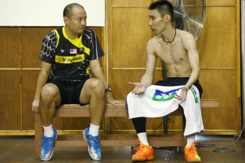 Hendrawan (kiri) bersama Chong Wei berbincang sesuatu selepas sesi latihan di Bukit Kiara.