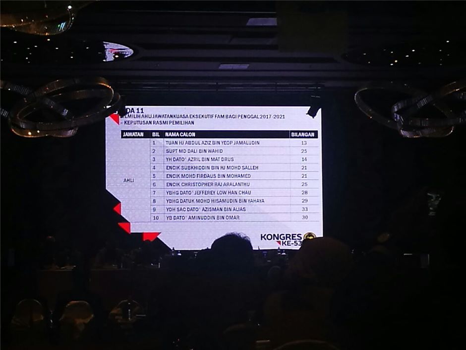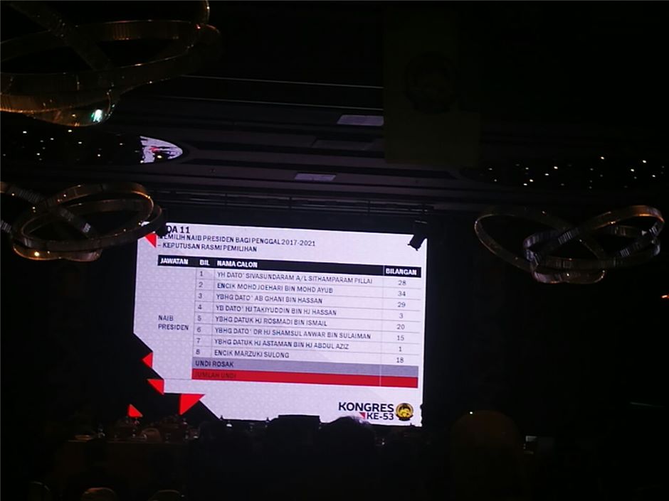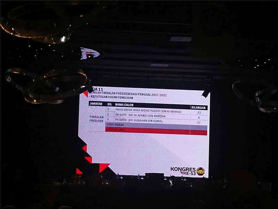 Datuk Seri Subahan Kamal (dua dari kiri) melihat keputusan bagi pemilihan jawatan timbalan presiden.