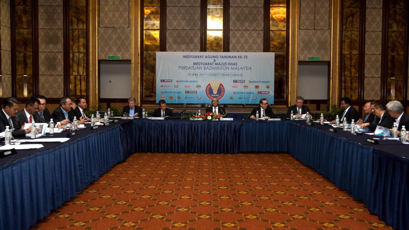 Tan Sri Mohamed Al Amin Abd Majid (tengah) mempengerusikan Mesyuarat Agung Tahunan Ke-72 dan Mesyuarat Majlis Khas Persatuan Badminton Malaysia pada Sabtu. -fotoBERNAMA