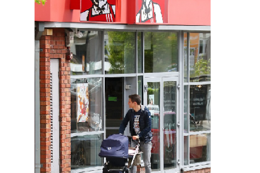 Sambil menolak stroller anaknya, Herrera dirakam sedang leka mengintai ke dalam sebuah restoran KFC.