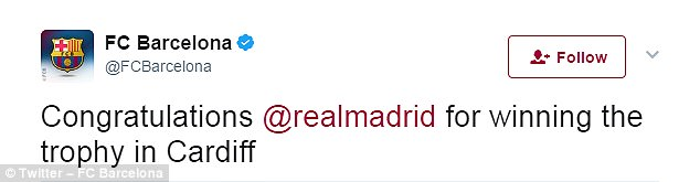 Ucapan tersebut dimuat naik di laman Twitter rasmi Barca seleaps Los Blancos merangkul gelaran juara Liga Juara-juara Eropha pagi Ahad.