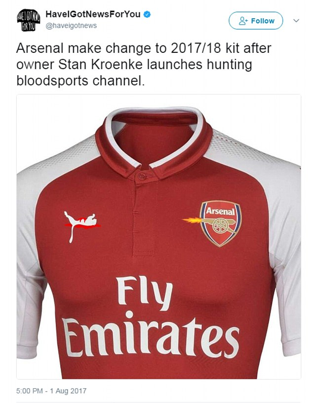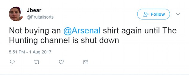 Seorang lagi netizen, Daniel Wernham menulis: 'As die hard Arsenal fans and animal lover i'm absolutely sickened by Stan Kroenke hunting tv channel and recent comments he made."