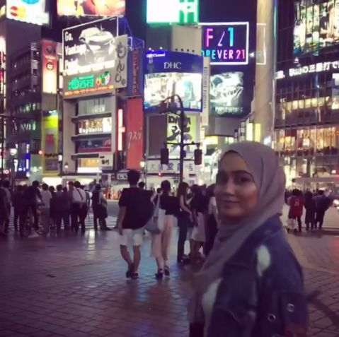 Dalam laman Instagramnya, Haliesah yang juga seorang model sebelum ini turut memuat naik video sedang melintas jalan popular di Tokyo iaitu Shibuya Crossing menggunakan aplikasi Boomerang.