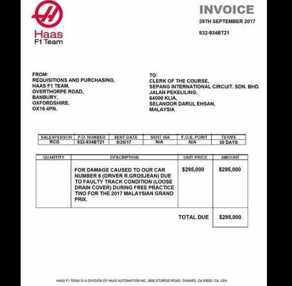 Dokumen itu menyatakan tuntutan itu perlu dibayar SIC selepas pemandu pasukan Haas, Romain Grosjean mengalami kemalangan setelah jentera dipandunya terlanggar penutup longkang di selekoh 13 pada sesi latihan kedua semalam sehingga memaksa sesi berkenaan dihentikan 20 minit lebih awal.