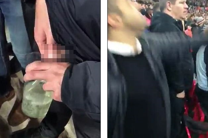 Lelaki itu kemudiannya memberikan kamera itu kepada rakannya untuk merakamkan aksinya melempar cawan tersebut ke arah penyokong West Ham.
