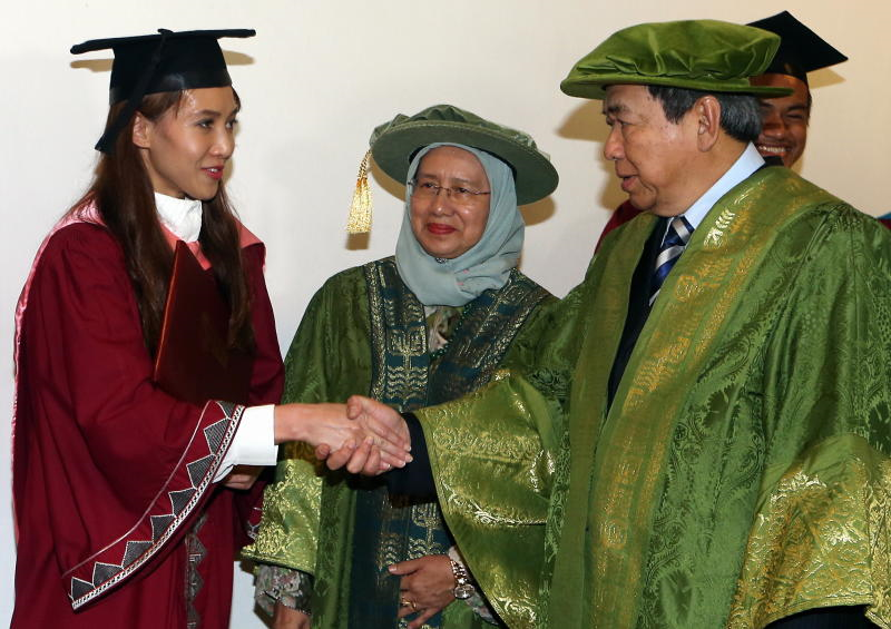 Mun Yee berjabat tangan dengan Sultan Selangor sambil diperhatikan oleh Naib Canselor UPM. Prof Datin Paduka Dr. Aini Ideris selepas tamat majlis konvokesyen.