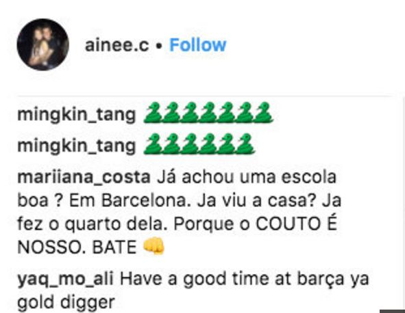 Dan, isteri Coutinho, Aine telah menjadi mangsa mesej 'pedas' dan kemarahan penyokong Liverpool di Instagram.