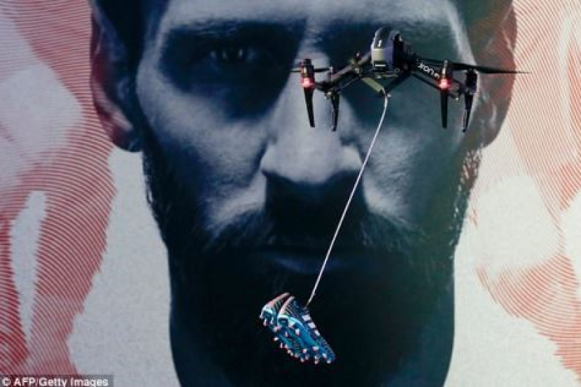 Pemain berusia 30 tahun itu kelihatan teruja apabila sebuah dron menghampirinya dengan membawa but yang mempunyai nama 'Messi'.