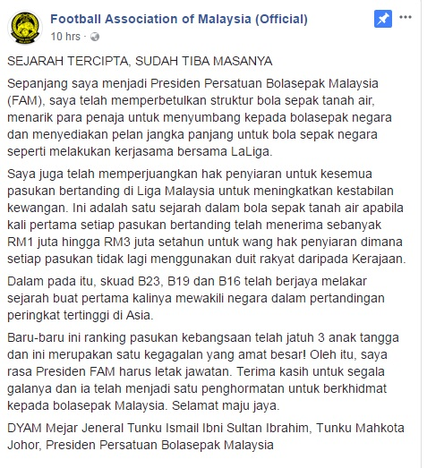 PETALING JAYA: Keputusan mengejut Tunku Mahkota Johor (TMJ) Tunku Ismail Sultan Ibrahim yang mahu meletak jawatan selaku presiden Persatuan Bola Sepak Malaysia (FAM) telah menggemparkan semua pihak.