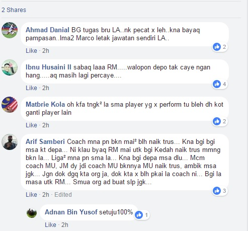 PETALING JAYA: Keputusan Persatuan Bola Sepak Kedah (KFA) menukar posisi Ketua Juruatih Ramon Marcote mendapat pelbagai reaksi daripada penyokong setia Lang Merah.