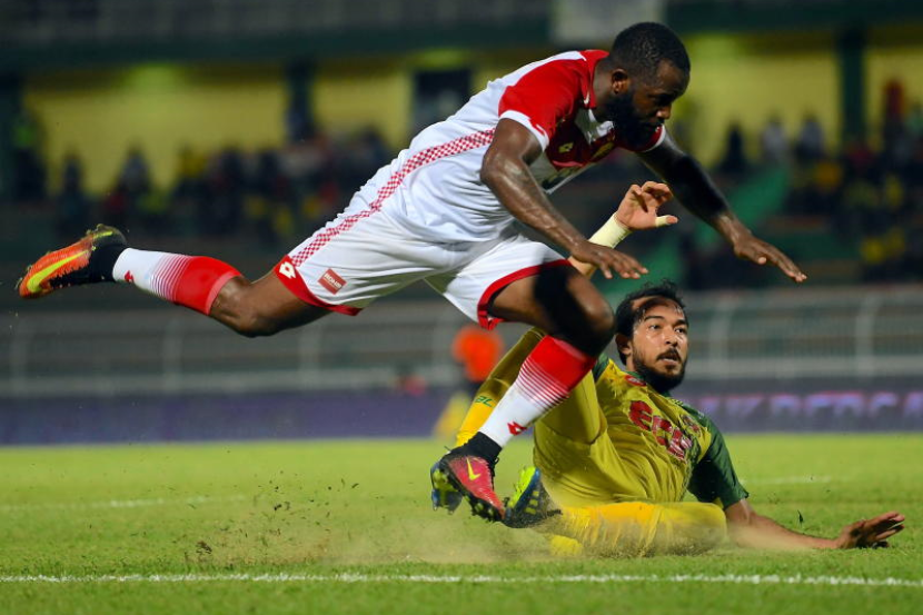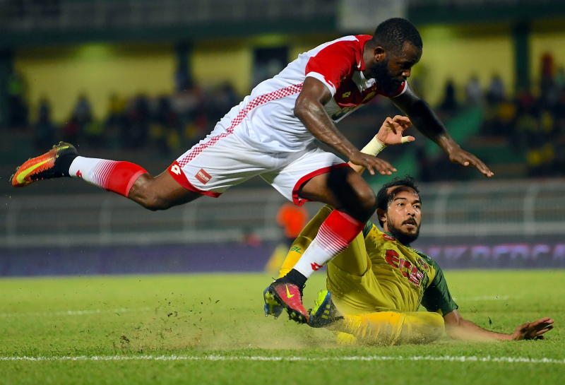 Pemain pertahanan Kedah Khairul Helmi Johari terjatuh diasak oleh pemain Kelantan Lazarus Kaimbi pada perlawanan Liga Super di Stadium Darul Aman malam Selasa. -fotoBERNAMA