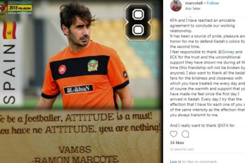 "Juga terima kasih kepada semua penyokong Kedah di atas kebaikan dan hubungan rapat yang sentiasa melayan saya dengan baik sejak hari pertama tiba di Kedah," jelas Marcote di status Instagramnya pada Isnin.