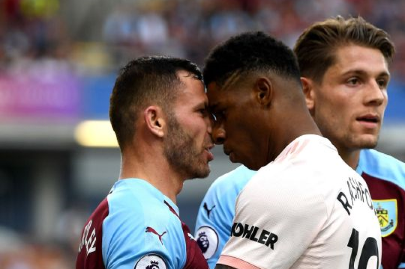 Dengan Manchester United sudah mendahului dengan 2-0, Rashford dilihat bergaduh dengan Bardsley.