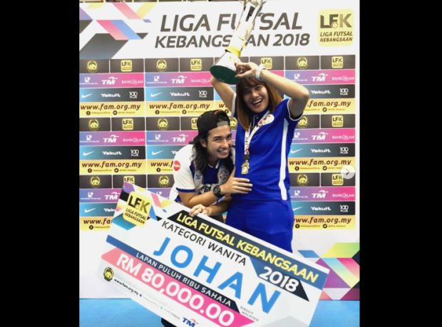 Niena dan suami bergambar bersama trofi dimenangi pasukan futsalnya, KL Felda United FC yang muncul juara Liga Futsal Kebangsaan (LFK) bagi kategori wanita bulan lalu.