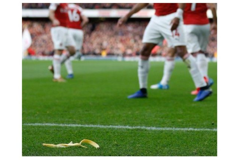 Kelihatan kulit pisang dibaling dari arah penonton Tottenham.