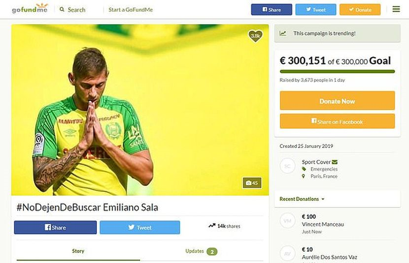 "Jumlah dana dilancarkan lewat Jumaat lalu yang membolehkan keluarga Emiliano Sala, menerusi organisasi khas untuk meneruskan pencarian bermula awal pagi Sabtu. Dua buah bot akan mengetuai operasi," jelas kenyataan GoFundMe.
