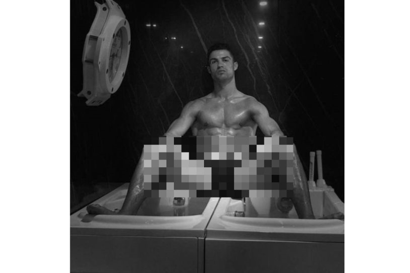 Dengan hanya berseluar dalam jenama 'Cristiano Ronaldo', pemain pasukan Portugal itu menunjukkan lengannya yang berotot di antara dua tab mandi.