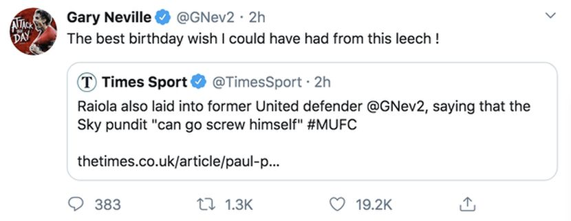 Susulan itu Raiola memberitahu The Times:"Gary Neville boleh pergi 'rosakkan' diri sendiri. Dia tidak pernah sukses dalam tugasnya di luar selain menjadi pemain hebat bola sepak hebat.