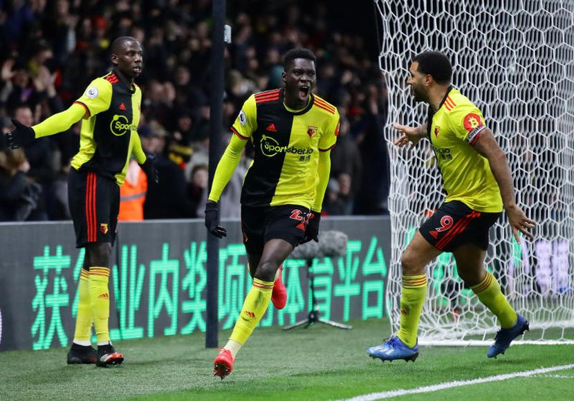 Ismaila Sarr (tengah) muncul wira the Hornets apabila berjaya menembusi gawang yang dikawal Alisson Becker sebanyak dua kali.