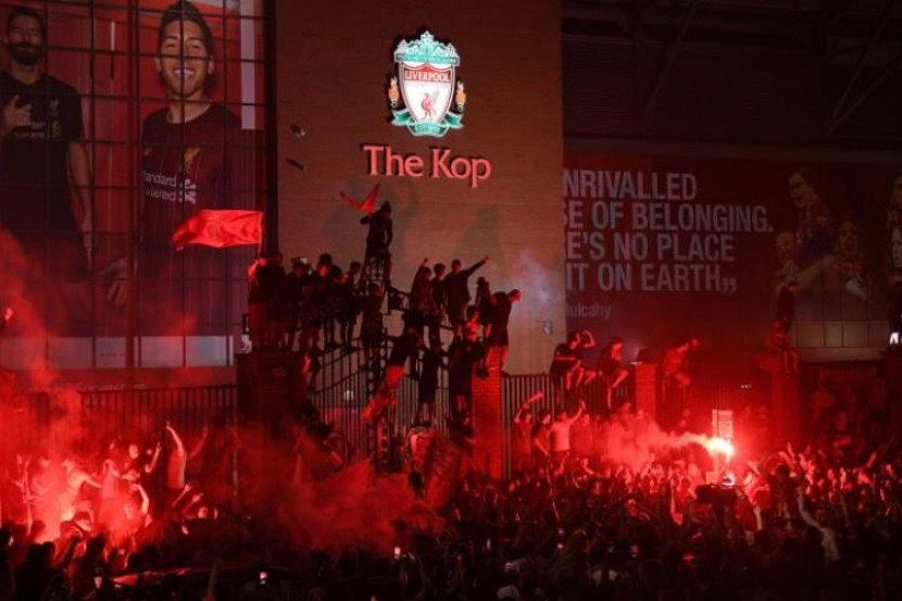 Penyokong-penyokong Liverpool meraikan kejayaan di Anfield.