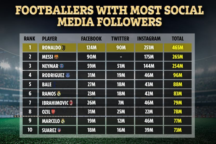 Penyerang Juventus berusia 35 tahun itu mempunyai 124 juta pengikut di Facebook, 90 juta di Twitter dan 251 juta di Instagram, menjadikan keseluruhan pengikutnya seramai 465 juta.