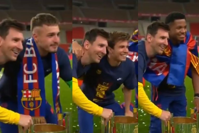 Menerusi video yang tular di laman sosial, kelihatan barisan pemain skuad Barcelona bergilir-gilir mengambil gambar dengan Messi bersama piala kemenangan mereka.